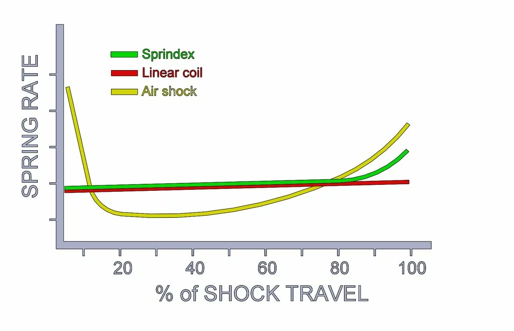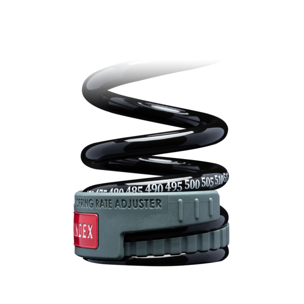 El Muelle SPRINDEX Ajustable es el único muelle del mercado que te da la posibilidad de ajustar la dureza. Una ingeniosa solución que te permite variar la dureza de un mismo muelle para conseguir un ajuste más preciso con tan solo girar el dial incluido. Por ejemplo, un muelle de 550 lb lo podrás pasar hasta 610 lb subiendo la dureza 10 lb en cada click.Como se consigue esto? Por que una de las características que definen la dureza de un muelle es el número de espiras que actúan, si reduces eso aumentas la dureza del muelle, ingenioso y sencillo.A pesar del novedoso sistema de ajuste de la dureza es un muelle ligero ya que está fabricado en el mismo material que otros muelles ligeros del mercado, acero Super High Tensile.Hay tres medidas de muelle disponibles: 55 mm, 65 mm y 75 mm. Cada largo de muelle tiene una capacidad de ajuste diferente, en general mientras más corto el muelle mayor es el rango de ajuste.Otra particularidad de este muelle es que incluye unos adaptadores para poderlo adaptar a la mayoría de amortiguadores del mercado, un mismo muelle para varias marcas ( Fox, Marzocchi, Rock Shox, Öhlins, DVO, Cane Creek, X-Fusion y más ) si quieres consultar la compatibilidad del muelle con tu amortiguador haz clic aquíLos adaptadores mejoran el ajuste entre el muelle y el amortiguador. Están hechos de Delrin lo que garantiza una baja fricción y gran resistencia. Mejoran el rendimiento del amortiguador al permitir que el muelle gire más libre durante la compresión.Además por cómo se han dispuesto las espiras es un muelle progresivo, siendo lineal en aproximadamente un 80% del recorrido y progresivo el 20% restante por lo que aguanta mejor en grandes impactos y absorbe muy bien las pequeñas irregularidades.¿Estamos ante el muelle definitivo? si no lo es, se acerca mucho.